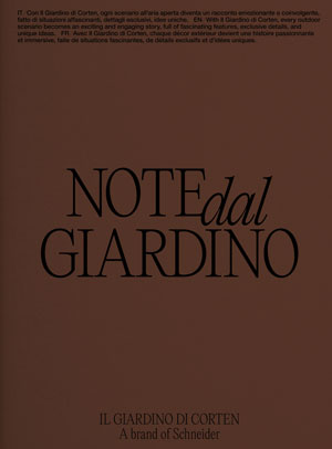 Il Giardino di Corten è la collezione di arredi e accessori creata da Schneider, antica officina con 150 anni di esperienza nella lavorazione dei metalli nobili, per dare forma a un originale concetto di vita all’aria aperta, nel quale si fondono armoniosamente il contatto con la natura e le nuove tendenze del design.