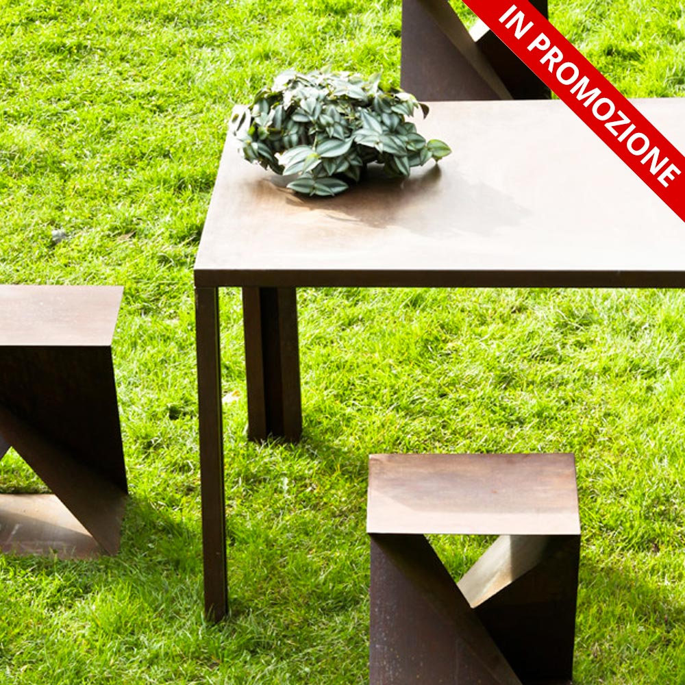 Une table carrée en Corten qui, aux lignes géométriques et essentielles, se distingue par la légèreté de sa structure : l’épaisseur du plateau et des pieds sont réduits et parfaitement proportionnés.